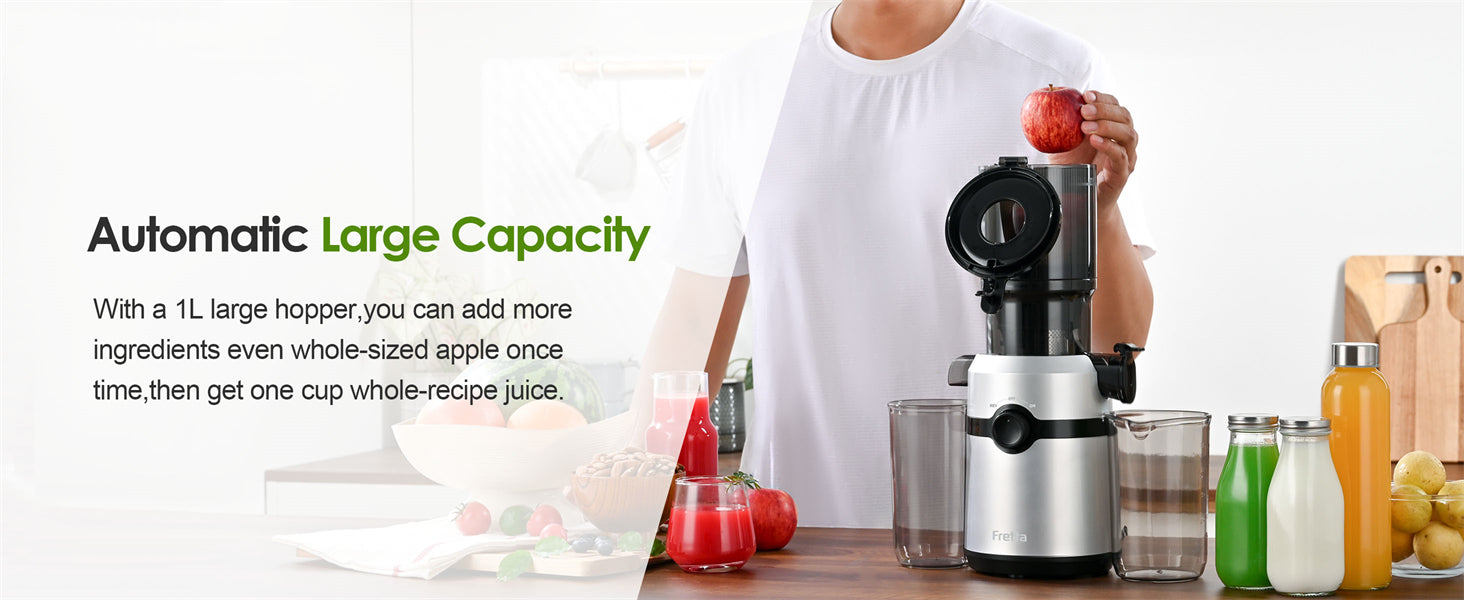 • 4.25'' large feeding chute, 1L capacity, fits whole fruits